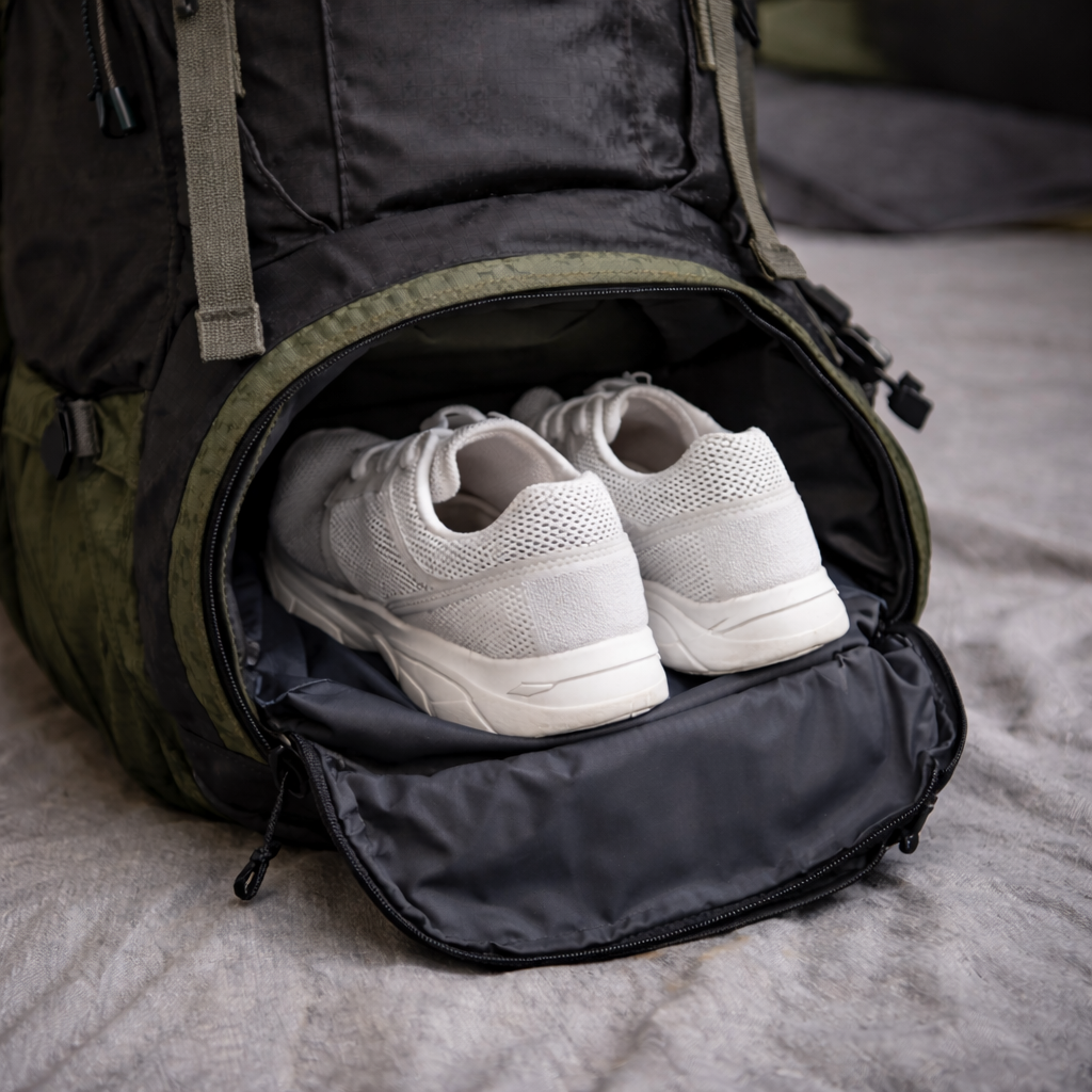 Ja. Onderin de backpack zit een apart schoenenvak, zodat schoenen gescheiden blijven van je kleding.