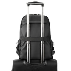 Aan de achterzijde bevindt zich een handige trolleyband. Hiermee schuif je de rugzak eenvoudig over de handgreep van een koffer — ideaal voor vlieg- en treinreizen.